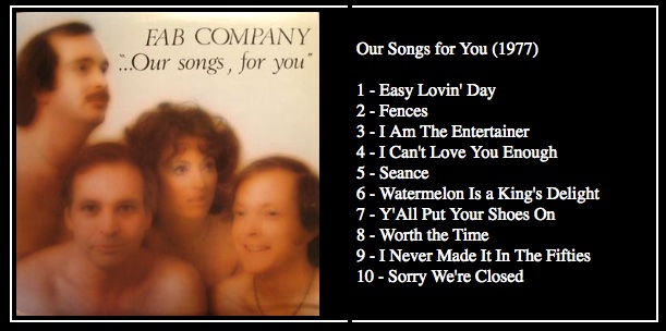 OUR SONGS FOR YOU  is the 3rd album Recorded by the FAB COMPANY at Applewood Studio in Denver Colorado in the early 1970s.  The Album was co-produced by Frank Bruen and Greene Danial.  Members of the FAB COMPANY included Frank Bruen, Ralph Achilles, Bonnie Ellison and Jerry Jacobs. This album includes a re-make of the groups hit "Watermelon is A Kings Delight.