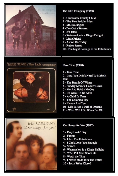 The first 3 albums recorded by this popular performing and recording group based in Denver in the early 1970s.  Album 1: The FAB Company   Album 2: TAKE TIME  Album 3: OUR SONGS FOR YOU.  The personnel on the first two albums are Frank Bruen, Ralph Achilles, and Bonnie Ellison.  Jerry Jacobs joined the group for the third album